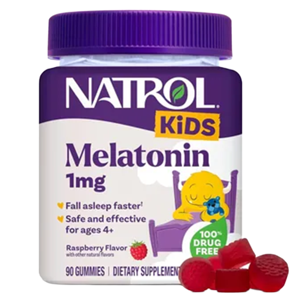 Suplemento infantil en gomitas con 1 mg de melatonina por porción, diseñado para apoyar el sueño en niños mayores de 4 años; libre de fármacos y aditivos artificiales.
