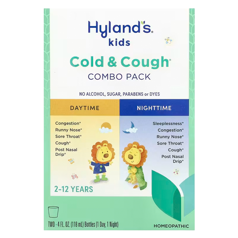 Hyland’s 4 Kids Cold ’n Cough Day & Night Combo Pack es un tratamiento homeopático diseñado para niños de 2 a 12 años, que proporciona alivio natural de los síntomas del resfriado común. La fórmula diurna alivia la congestión nasal y torácica, secreción nasal, dolor de garganta, estornudos y tos. La fórmula nocturna incluye ingredientes adicionales para ayudar con el insomnio ocasional, permitiendo un descanso reparador. Ambas fórmulas están libres de alcohol, azúcar, colorantes y parabenos, y contienen ingredientes activos naturales.