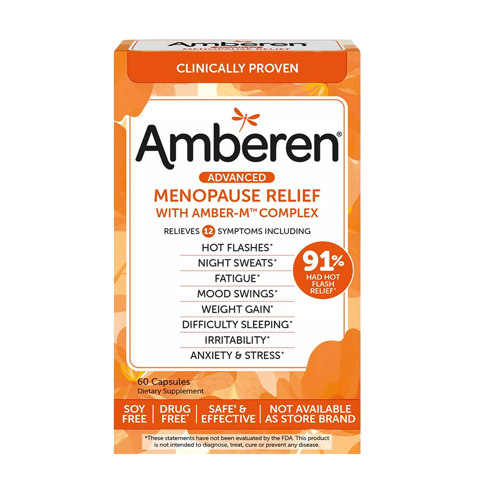 Suplemento clínicamente probado con Amber-M™ Complex que ayuda a aliviar 12 síntomas de la menopausia, incluyendo sofocos, sudoración nocturna, fatiga, cambios de humor y estrés. Libre de soya y fármacos.