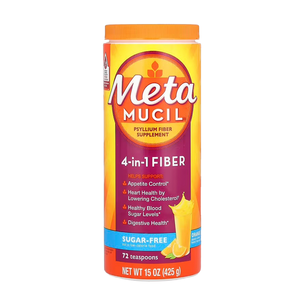 Suplemento de fibra de psyllium en polvo con 4 beneficios: control del apetito, reducción del colesterol, estabilización del azúcar en sangre y salud digestiva. Libre de azúcar, con 30 sobres.